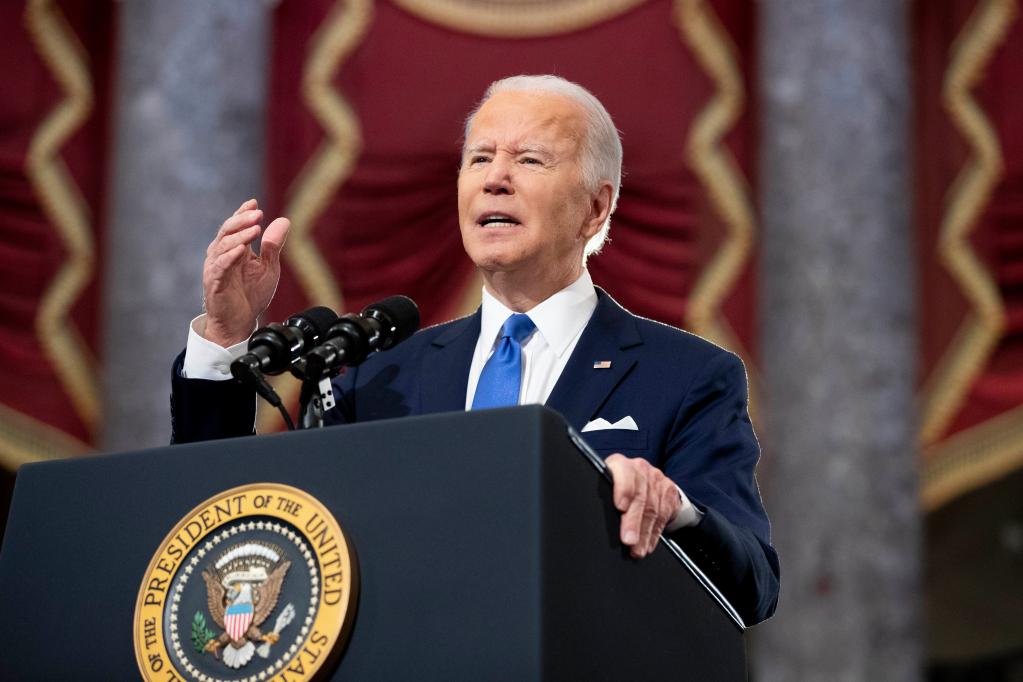 1月6日,美国总统拜登在华盛顿国会大厦发表讲话,纪念国会山骚乱事件一周年。新华社发(Pool图片/格雷格·纳什摄)
