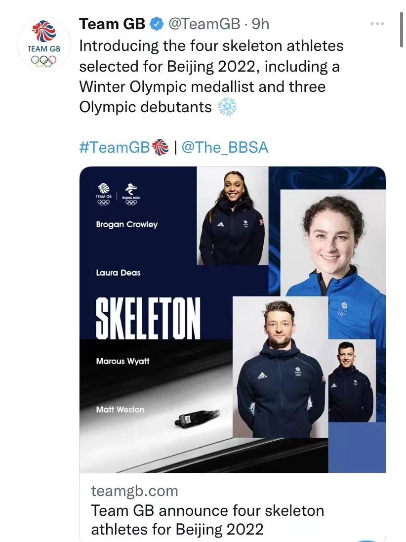 两位男将也把目光瞄准奖牌。24岁的韦斯顿说:“我简直不敢相信这是真的。我不仅入选了北京冬奥会英国代表团,而且目标还是夺得奖牌。”