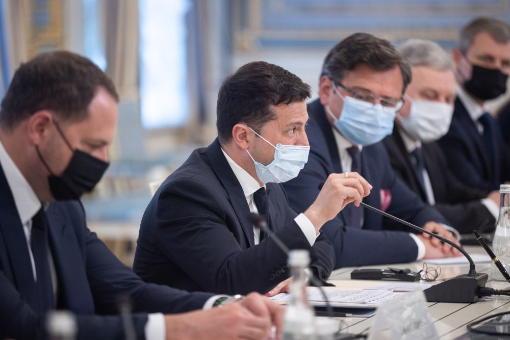 2021年5月6日,乌克兰总统泽连斯基(左二)在基辅会见到访的美国国务卿布林肯,双方就乌东部局势、乌加入北约前景、乌国内改革等问题交换看法。(新华社发)
