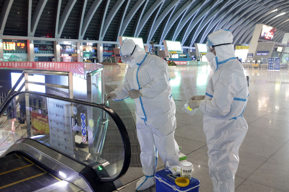 1月11日疾控人员在天津西站采集环境检测样本。(新华社发)