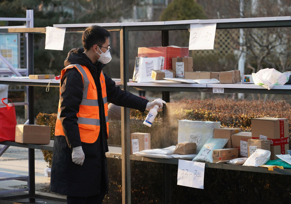 1月18日,北京市海淀区马连洼街道永丰路百旺茉莉园一期外,工作人员对快递进行消毒。(新华社记者任超 摄)