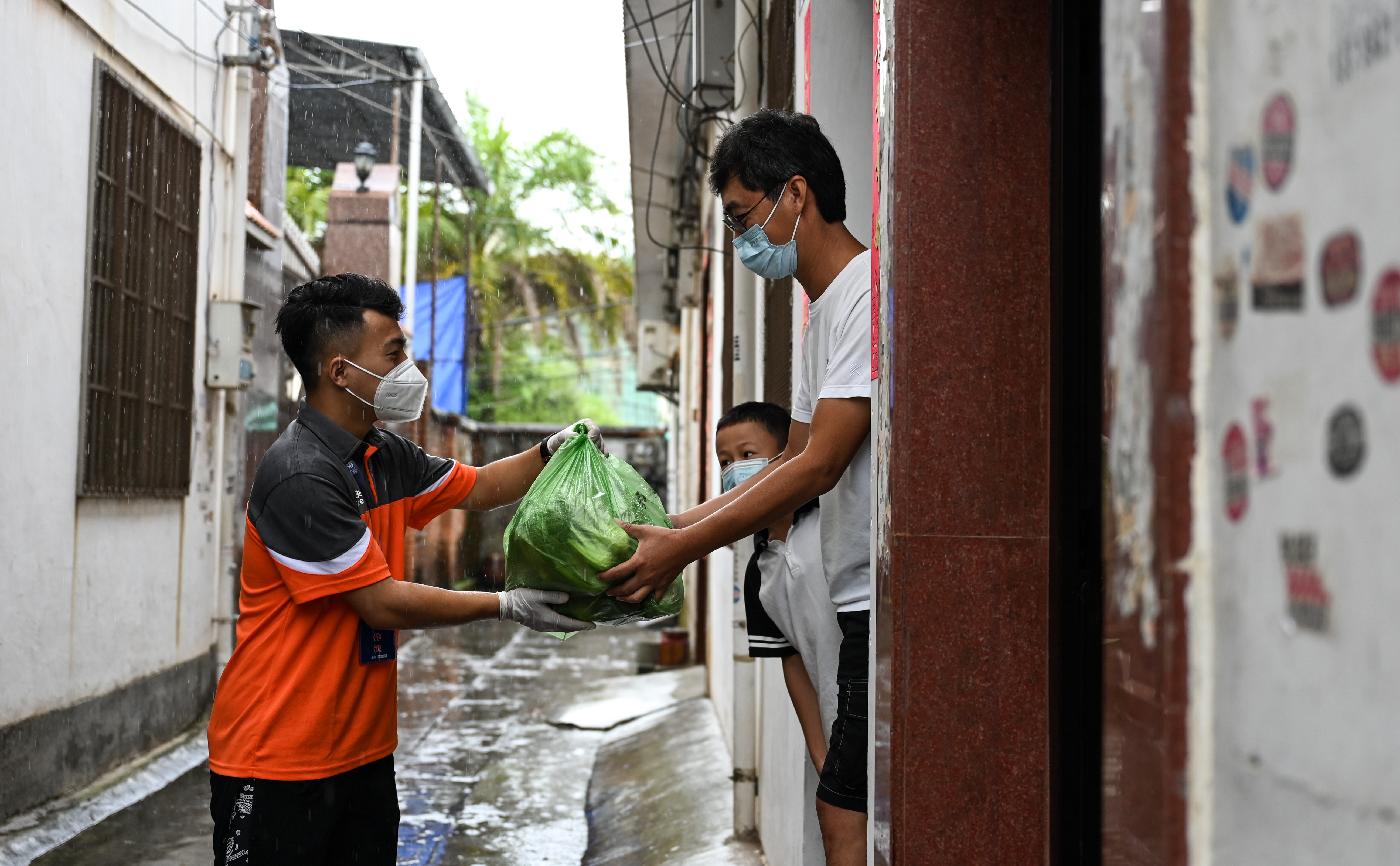 在云南省德宏傣族景颇族自治州瑞丽市,快递行业志愿者将生活物资送至居民家(2021年7月9日摄)。(新华社记者王冠森摄)