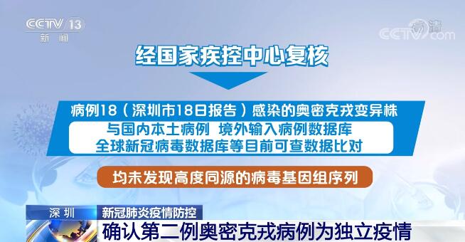 经国家疾控中心复核,该病例感染的奥密克戎变异株与国内本土病例、境外输入病例数据库、全球新冠病毒数据库等目前可查数据比对,均未发现高度同源的病毒基因组序列。此外,深圳的首例奥密克戎病例感染的奥密克戎变异株与病例18感染的奥密克戎变异株为不同的进化分支,属不同来源。