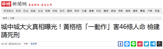 【环球网综合报道 记者 赵友平】台湾“中时新闻网”、“中央社”消息称,高雄“城中城”大火致46死,高雄地检署侦结后分析涉案黄格格因吃醋喝闷酒想借点火让其男友难堪,将未熄灭的香灰倒在小套房的皮沙发上,导致房内闪燃,一楼陷入火海。高雄地检署21日依“杀人罪”、“公共危险罪”起诉,建请法官求处极刑。