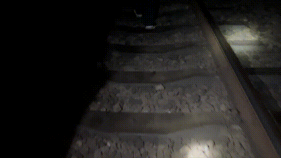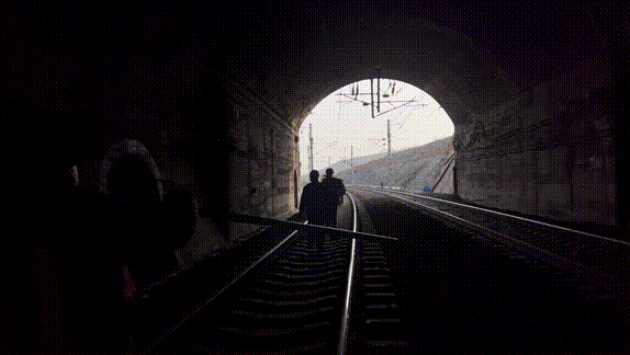 隧道里越走越黑,工人不但要用强光手电检查拱顶和侧壁,还要注意脚下——扣件、轨枕、电缆盒很容易把人绊倒。