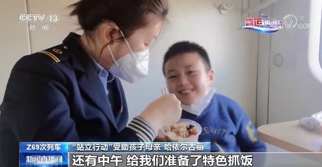 在列车上,乘务人员们将9号卧铺车厢设立为“爱心车厢”,由专人负责孩子们的洗漱、上卫生间等工作,而餐车根据孩子们的口味也特别烹饪了具有新疆风味的饭菜。