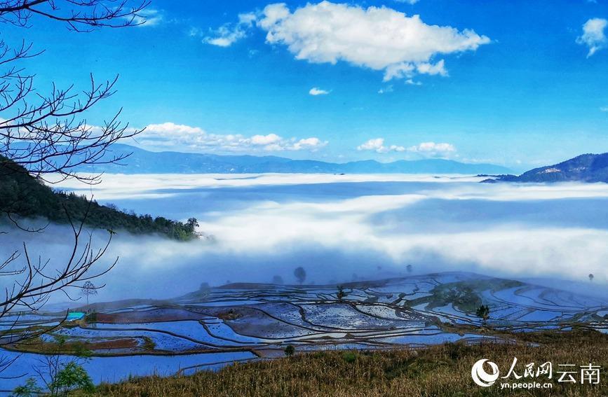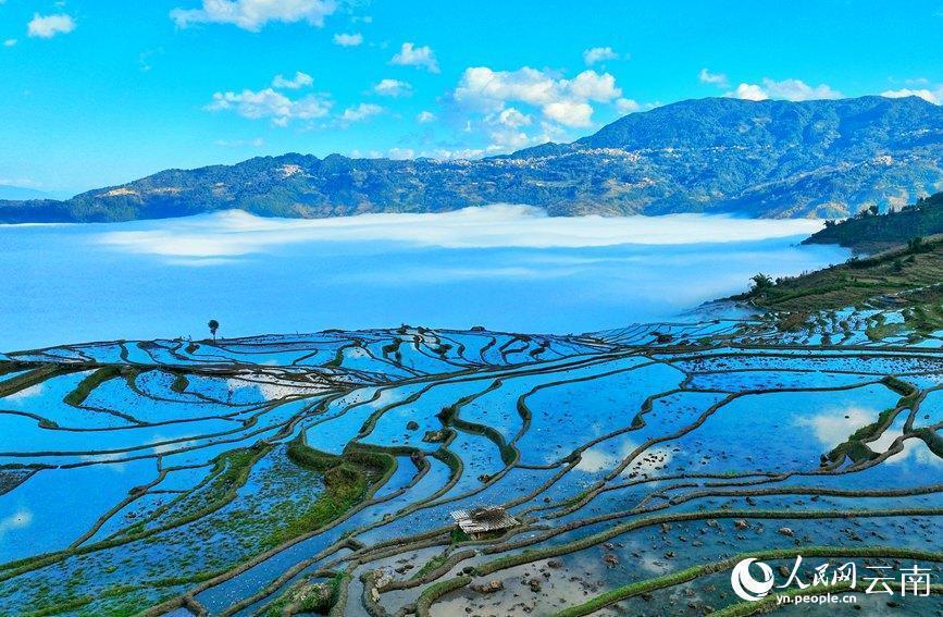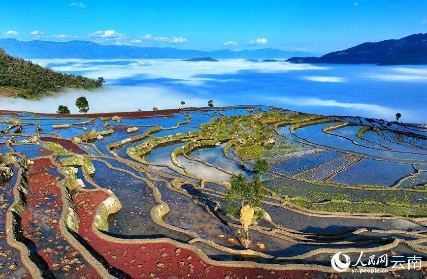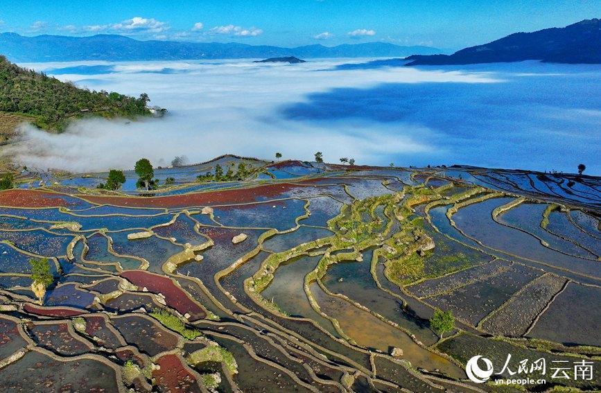 近日,位于云南省红河哈尼族彝族自治州红河县的撒玛坝梯田已全部灌水,云雾缭绕,景美如画,迎来最佳观赏季。