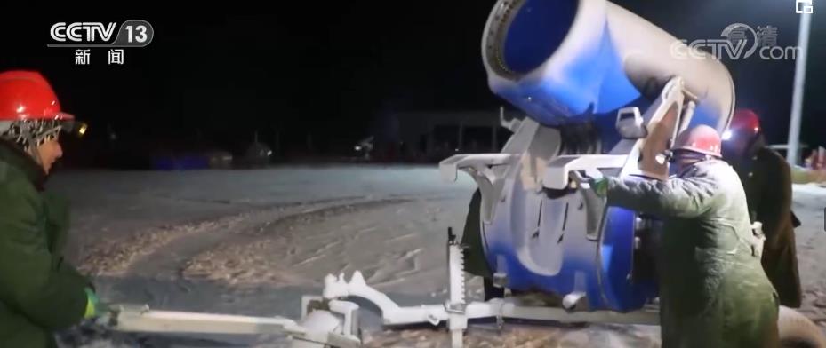 经过一整天的训练,3.5公里长的越野滑雪赛道的雪面已经受损,部分赛道边缘出现缺口。为了保障第二天队员们的正常训练,工友们要抓紧时间对雪道进行修复。第一步是造雪,就是先用造雪机把水雾化吹到空气中,雾化后的水与寒冷的空气相遇后便形成了雪花。
