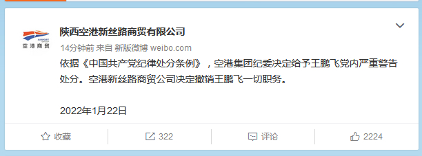 中新网1月22日电 陕西空港新丝路商贸有限公司22日在其官方微博上发布公告称,依据《中国共产党纪律处分条例》,空港集团纪委决定给予王鹏飞党内严重警告处分。空港新丝路商贸公司决定撤销王鹏飞一切职务。