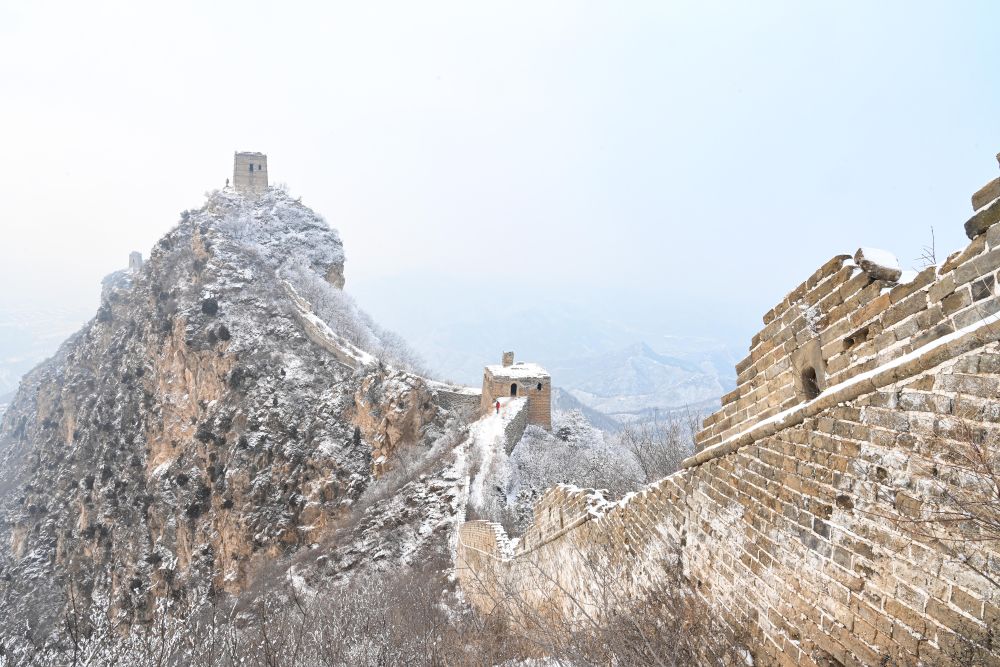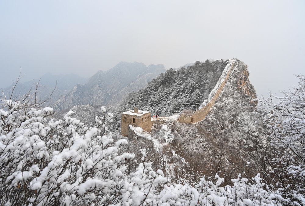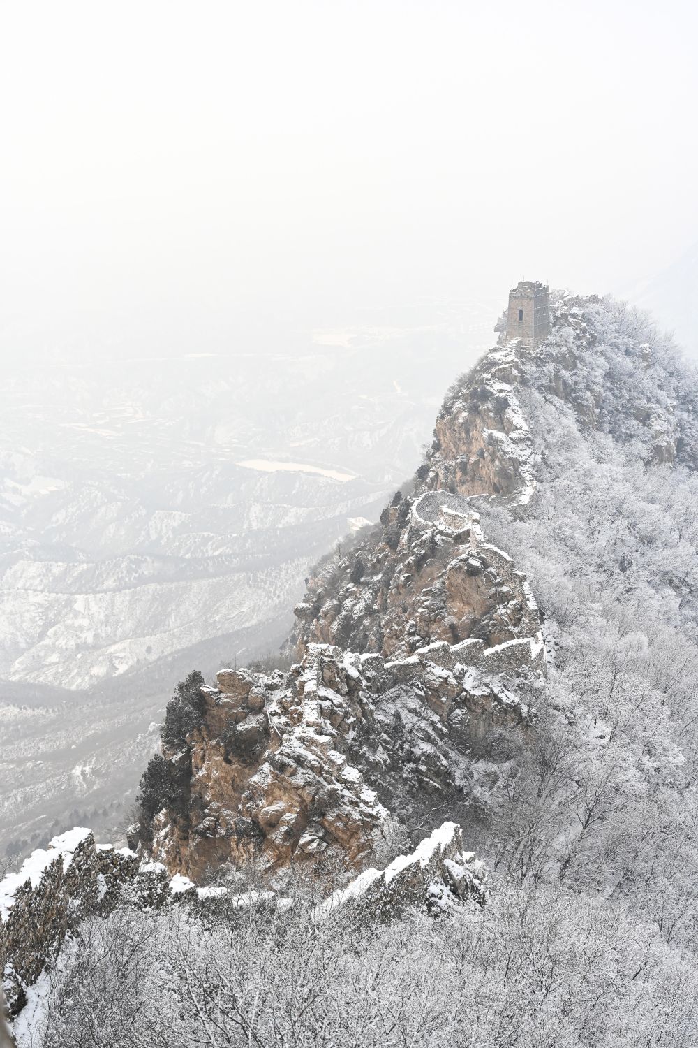 近日,北京迎来降雪天气。位于北京市密云区和河北省滦平县交界处附近的长城望京楼、仙女楼等段长城,在白雪的映衬下更加雄奇壮观。