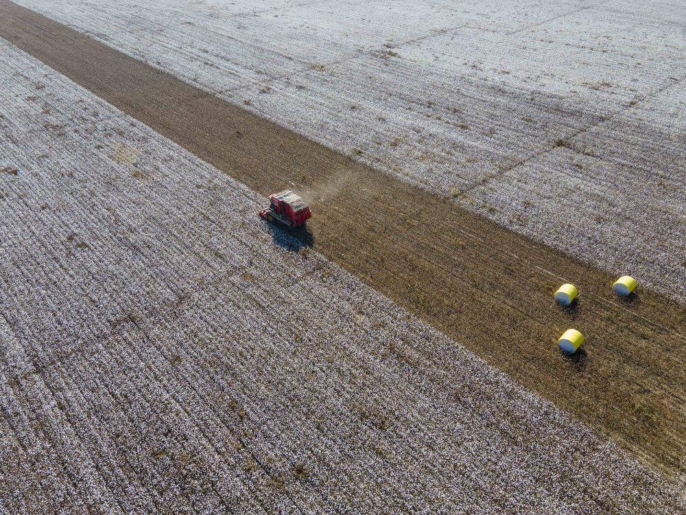 资料图:在新疆塔城地区沙湾市大泉乡三道沟村,采棉机在棉田里采收棉花。新华社记者胡虎虎摄