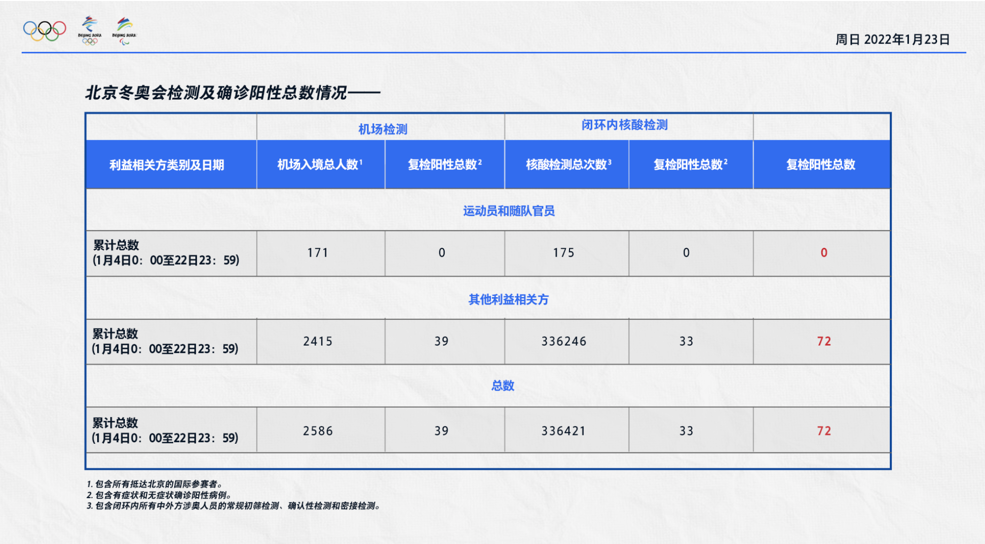 1月4日0:00至22日23:59,闭环内核酸检测总次数336421,其中运动员及随队官员175,其他利益相关方336246。复检阳性33人,均来自其他利益相关方。
