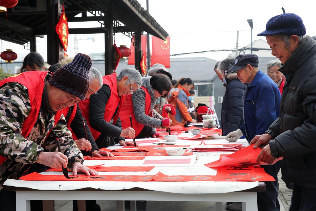 2022年1月15日,在浙江省湖州市德清县乾元镇东郊社区,志愿者给居民书写春联。新华社发(倪立芳 摄)