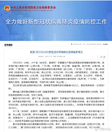 截至1月23日24时,据31个省(自治区、直辖市)和新疆生产建设兵团报告,现有确诊病例2754例(其中重症病例11例),累计治愈出院病例98270例,累计死亡病例4636例,累计报告确诊病例105660例,现有疑似病例7例。累计追踪到密切接触者1502026人,尚在医学观察的密切接触者46145人。