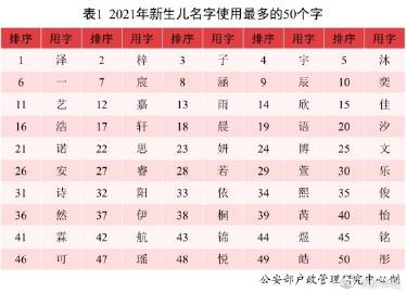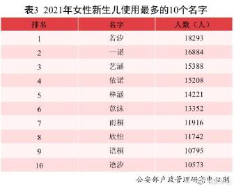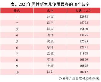 2021年出生并已经进行户籍登记的男性新生儿中,使用频率最高的10个名字依次为:沐宸、浩宇、沐辰、茗泽、奕辰、宇泽、浩然、奕泽、宇轩、沐阳。其中“沐宸”使用人数达到2.3万,登顶榜首,成为男性新生儿名字首选。2021年出生并已经进行户籍登记的女性新生儿中,使用频率最高的10个名字依次为:若汐、一诺、艺涵、依诺、梓涵、苡沫、雨桐、欣怡、语桐、语汐。其中“若汐”使用人数达到1.8万,登顶榜首,成为女性新生儿名字首选。(记者熊丰)