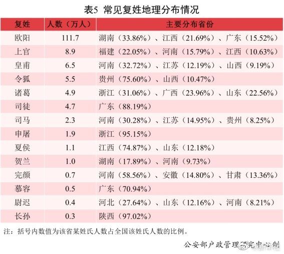 【常见姓氏分布,看看你的姓氏聚集在哪最多】公安部户政管理研究中心24日发布2021年全国姓名报告。根据报告,姓氏在我国有着明显的地域分布特征。王、李、张等二十二个姓氏人口分布最多的省份是河南;陈、黄、吴等二十个姓氏人口分布最多的省份是广东;刘、孙、高等十二个姓氏人口分布最多的省份是山东;邹、熊、万三个姓氏人口分布最多的省份是江西。常见复姓“聚居”的特点非常突出,复姓人口在个别省份的分布较为集中。如,复姓“欧阳”33.86%的人口分布在湖南;复姓“上官”22.05%的人口分布在福建;复姓“皇甫”32.72%的人口分布在河南;复姓“令狐”75.60%的人口分布在贵州;复姓“诸葛”31.06%的人口分布在浙江;复姓“司徒”88.19%的人口分布在广东。(记者熊丰)