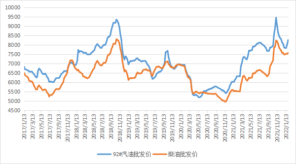 图表:中国汽柴油批发价格指数周度均价走势图(单位:元/吨)