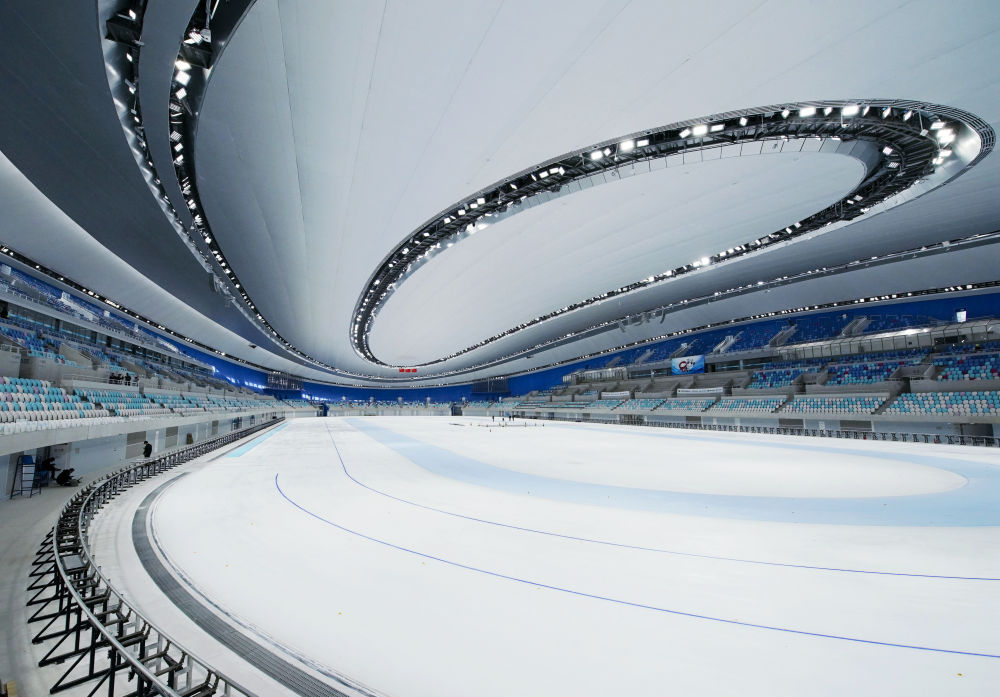 2021年5月10日,北京冬奥会标志性场馆国家速滑馆“冰丝带”开展首次全冰面制冰,规模约1.2万平方米的场馆全冰面成功亮相。新华社记者 张晨霖 摄