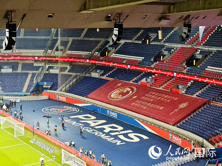 当地时间23日,巴黎王子公园球场打出巨幅中文标语“巴黎圣日尔曼祝中国球迷朋友虎年大吉、虎虎生威!” 人民网记者 李永群摄