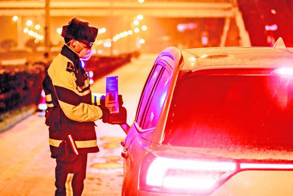 1月22日,在天津市津南区某公路卡口处,骑警队员在雪夜里保障救护车辆进入通畅。新华社发(张吉蔚摄)