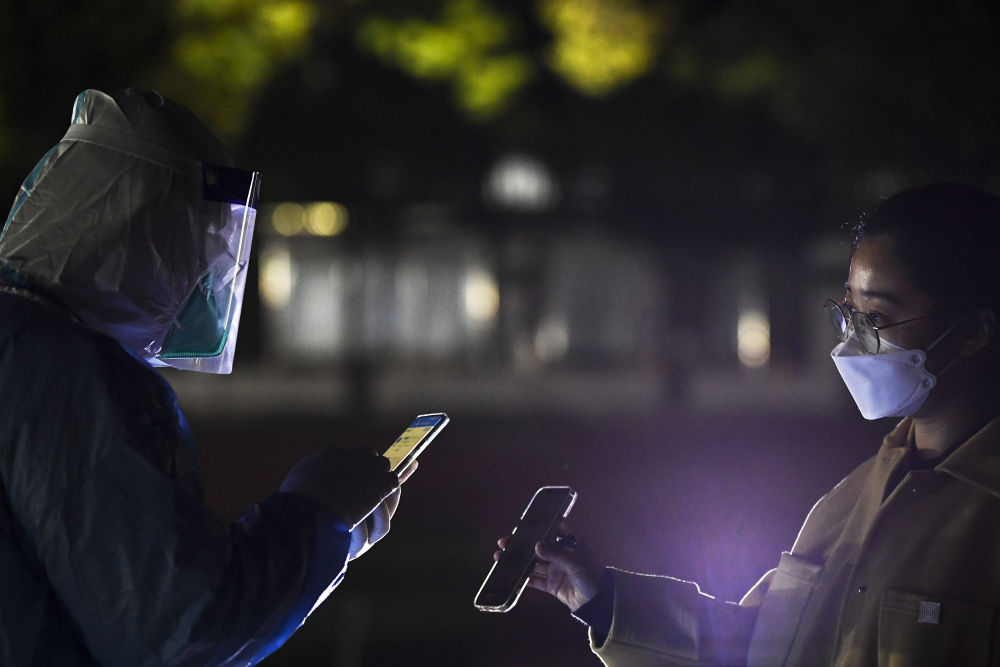 ↑2021年10月23日,在宁夏银川市金凤区北京中路街道采样点,医务人员(左)在扫码登记居民信息。