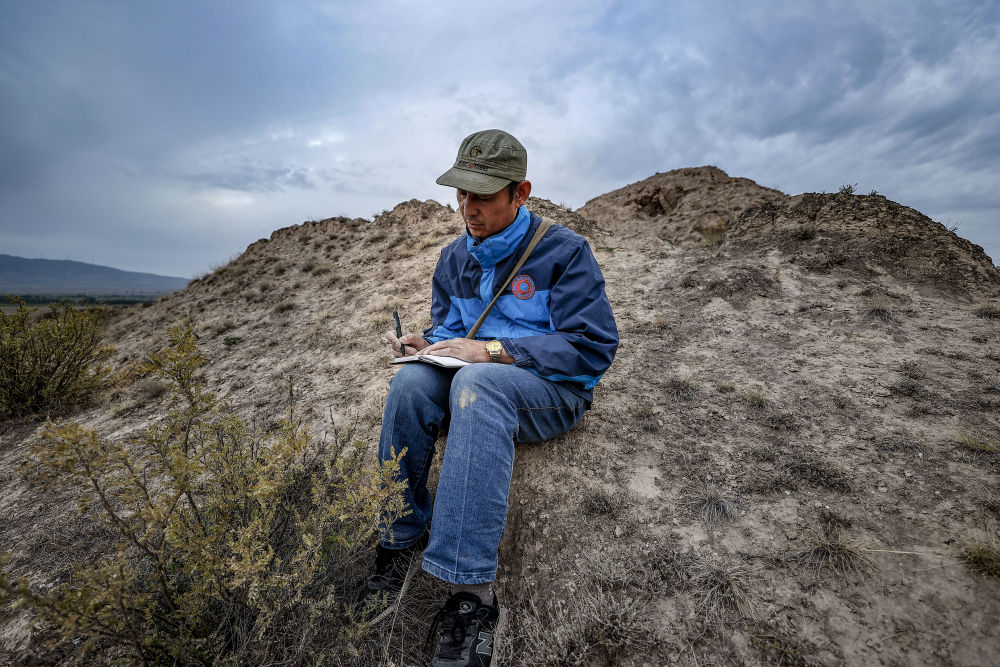 ↑2021年8月12日,李世翔在宁夏海原县巡查陈家湾烽火台时做笔记。