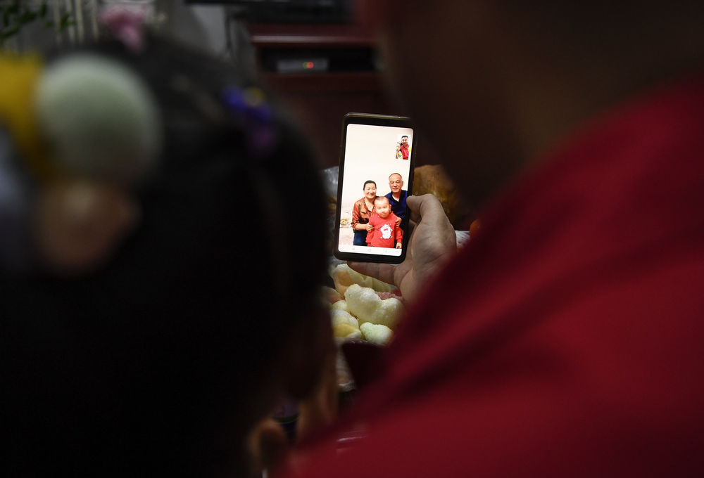 ↑2021年2月11日除夕夜,王涛和妻子女儿在宿舍同在银川的父母和2岁的儿子通视频电话。