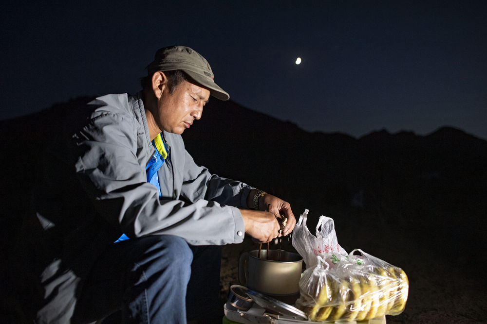↑2021年8月13日晚,李世翔在宁夏银川市境内的三关口土夯明长城附近吃晚饭。为节省时间和开支,他自带了泡面、饼子和咸菜。
