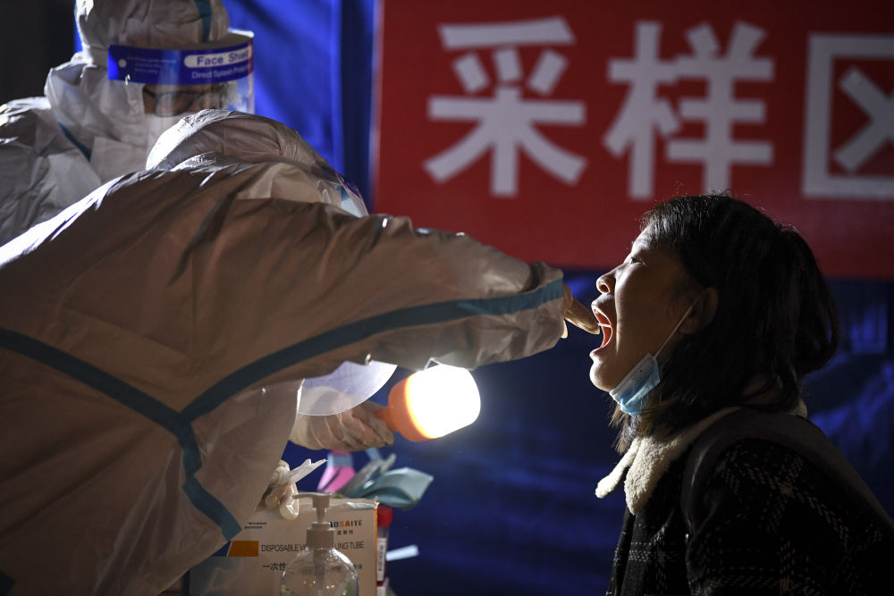 ↑2021年10月23日,在宁夏银川市兴庆区凤凰北街采样点,宁医大总院全科医学科临床主治医师马伶馨(左二)为居民进行核酸采样。