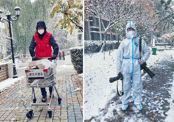 ↑左图为2021年11月6日上午,新华社记者冯开华在银川市兴庆区一处隔离小区做志愿服务;右图为2021年11月6日下午,新华社记者冯开华在银川市金凤区一处中风险社区采访。