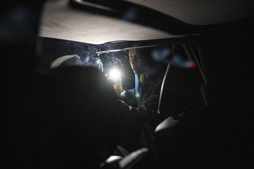 ↑2021年8月13日晚,李世翔在车里点起蚊香,当晚他在宁夏银川市境内的三关口土夯明长城附近露宿。