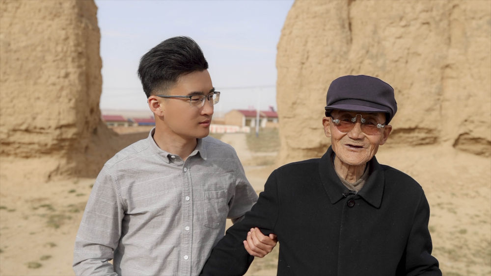 ↑新华社记者冯开华(左)向其太爷冯振林了解毛泽民与羊皮大氅的故事(视频截图)。