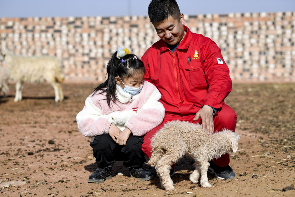 ↑7岁的王思淇第一次来到爸爸王涛驻村的红井子村,她对一切都充满了好奇。2021年2月11日,王涛和王思淇在抚摸一只农户家的小羊羔。
