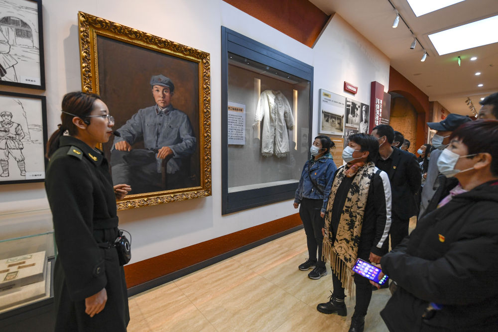 ↑2021年4月15日,宁夏盐池县革命烈士纪念馆讲解员(左一)为前来参观的游客介绍毛泽民在盐池县的故事。