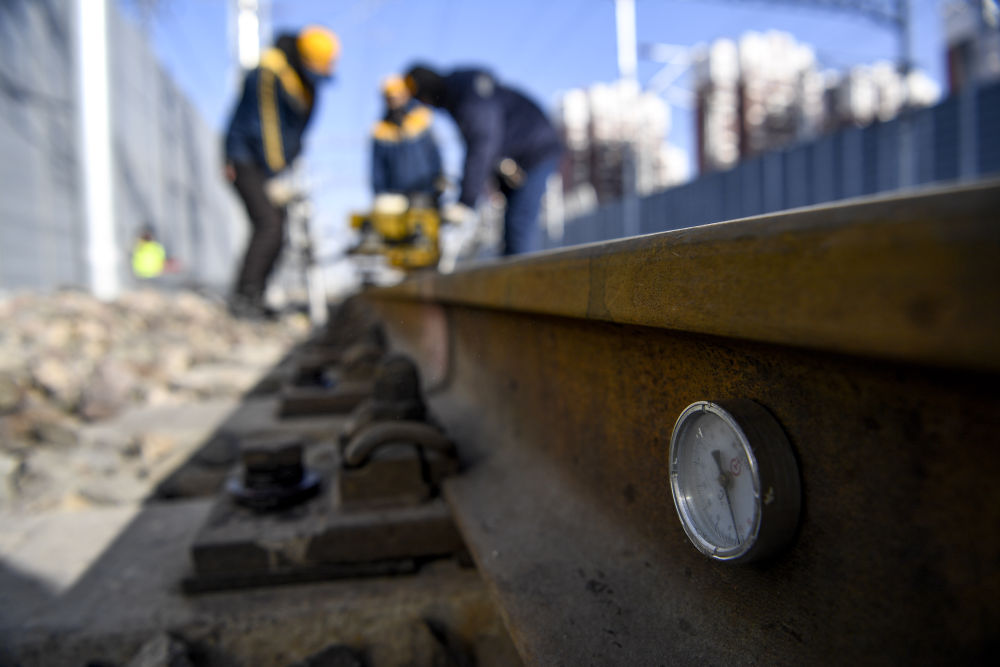 ↑2021年1月6日,中铁兰州局银川工务段职工进行捣固作业。