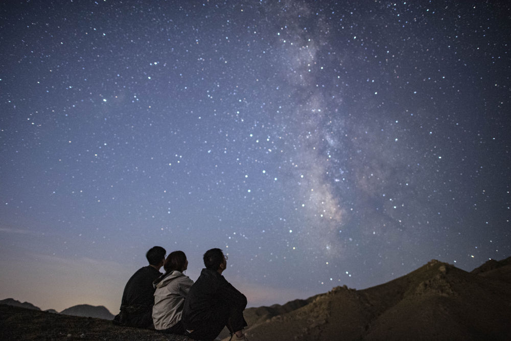 ↑新华社记者冯开华、马思嘉和唐如峰(从左至右)采访结束后,在长城脚下仰望星空(2021年8月13日摄)。
