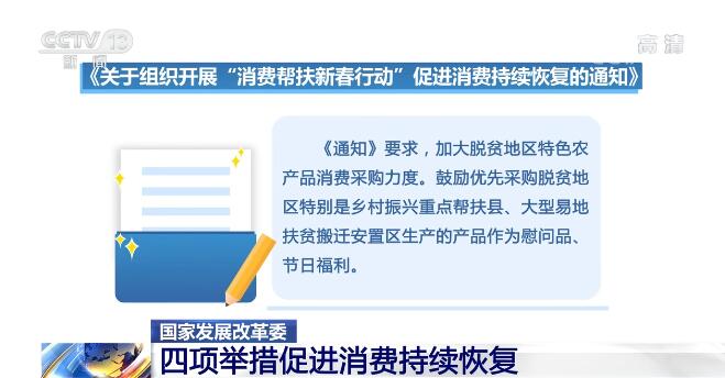 央视网消息:国家发展改革委近日印发《关于组织开展“消费帮扶新春行动”促进消费持续恢复的通知》。通过四项举措,强化对脱贫地区特别是乡村振兴帮扶县、大型易地扶贫搬迁安置区产品和服务的帮销力度。