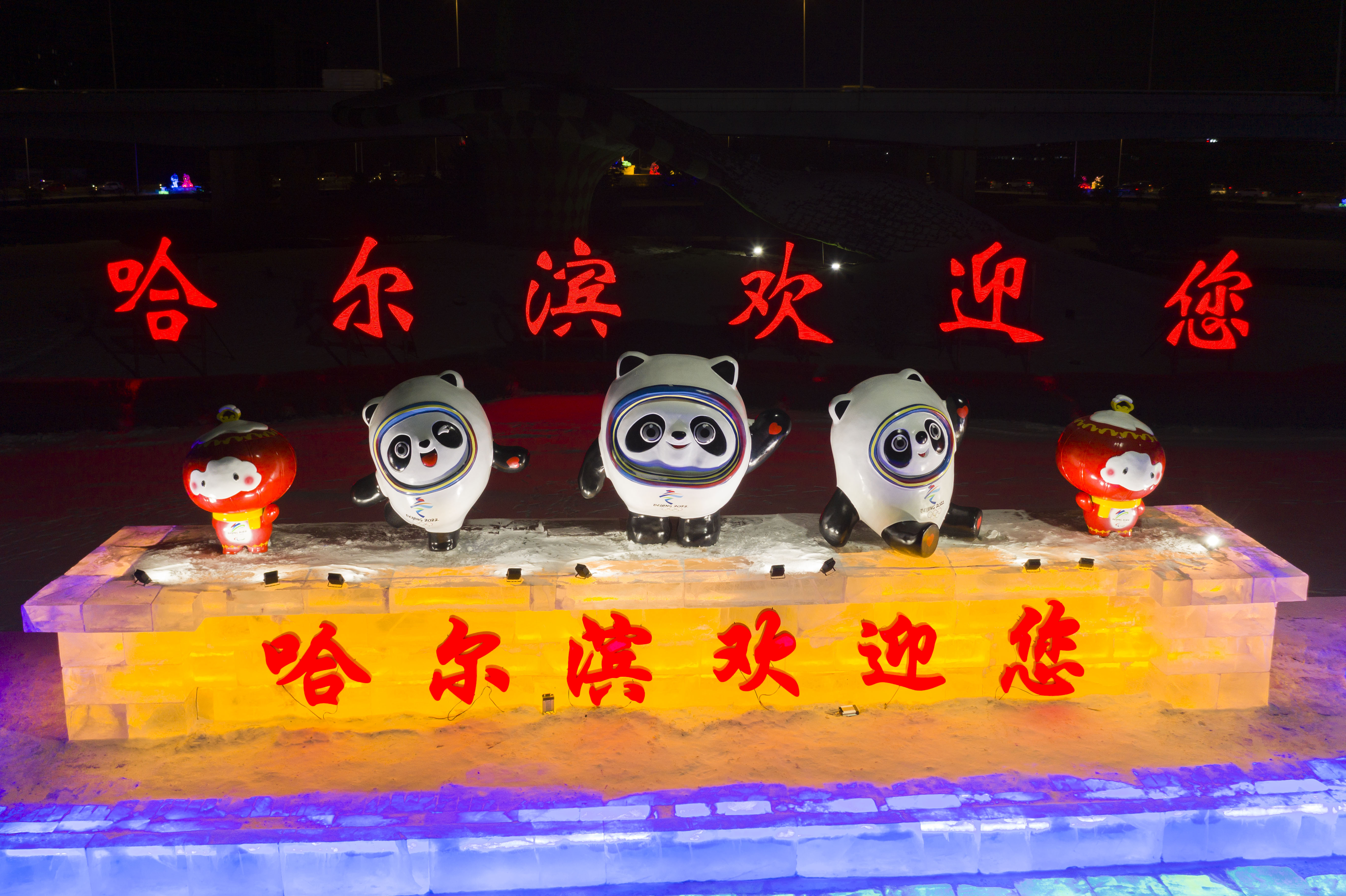 在“百年老街”中央大街,北京2022年冬奥会吉祥物“冰墩墩”和冬残奥会吉祥物“雪容融”变身巨大冰雕,“冰里有条鱼”的话题登上网络热搜榜。周边冰景还有火炬冰柱,加上沿街悬挂的彩灯、中国结,好不热闹。