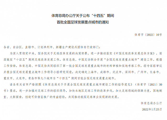 国家体育总局网站25日消息,体育总局办公厅公布“十四五”期间首批全国足球发展重点城市。经专家组审议并报全国足球发展重点城市工作领导小组研究同意,决定确定上海市、成都市、武汉市、深圳市、广州市、长春市、重庆市、大连市、青岛市等九个城市为“十四五”期间首批全国足球发展重点城市。
