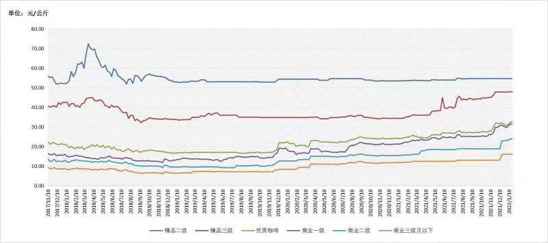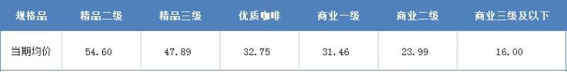 具体来看,精品二级咖啡豆均价报54.60元/公斤,较上期持平;精品三级咖啡豆均价报47.89元/公斤,较上期持平;优质咖啡豆均价报32.75元/公斤,较上期上涨0.50元/公斤,涨幅1.55%;商业一级咖啡豆均价报31.46元/公斤,较上期上涨0.05元/公斤,涨幅0.16%;商业二级咖啡豆均价报23.99元/公斤,较上期上涨0.18元/公斤,涨幅0.76%;商业三级及以下咖啡豆均价报16.00元/公斤,较上期持平。