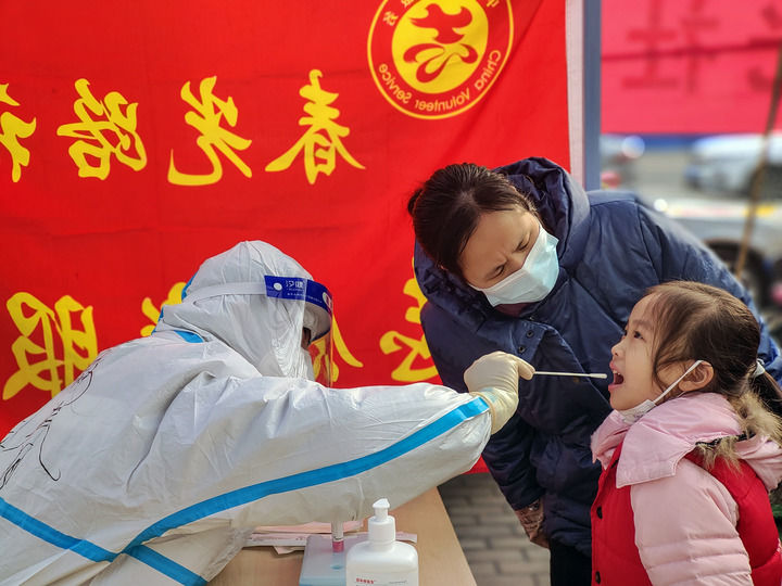 在安阳市文峰区紫薇大道街道春光路社区,医护人员为一名小朋友进行核酸检测取样(1月11日麻翛然摄)