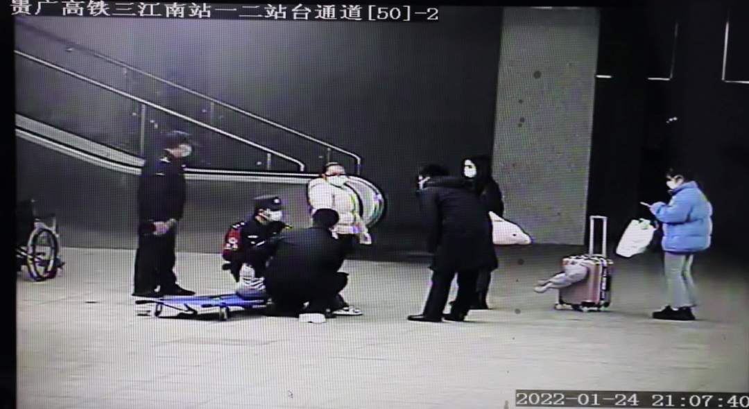 1月24日晚20点20分,贵广高铁三江南站检票口外侧一站台的扶梯入口处,有位旅客突发疾病晕倒,铁路工作人员和派出所民警闻讯后,立即前往事发现场,并紧急联系出站口医护人员赶来救治。