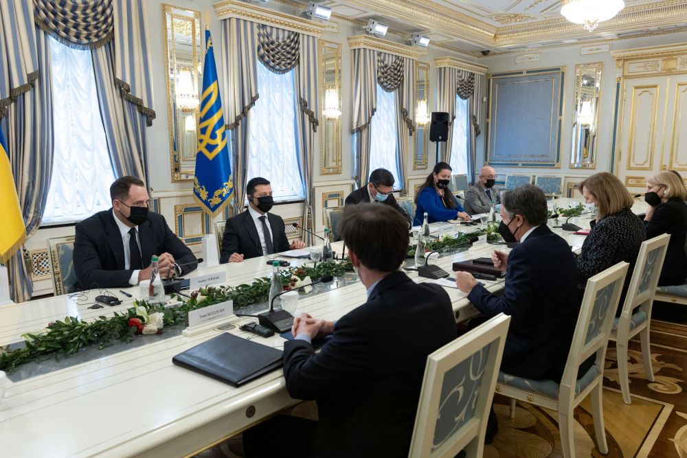1月19日,乌克兰总统泽连斯基(左二)在基辅会见美国国务卿布林肯(右三)。(新华社发,乌克兰总统办公室供图)