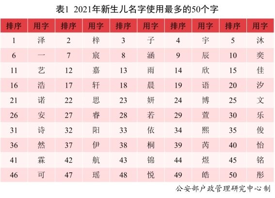 报告显示,2021年出生并已经进行户籍登记的新生儿名字中,使用频率最高的50个字依次为泽、梓、子、宇、沐等。