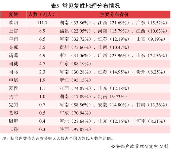 复姓“欧阳”33.86%的人口分布在湖南;复姓“皇甫”32.72%的人口分布在河南;复姓“诸葛”31.06%的人口分布在浙江;复姓“司徒”88.19%的人口分布在广东;复姓“司马”30.28%的人口分布在河南;复姓“夏侯”74.87%的人口分布在江西。