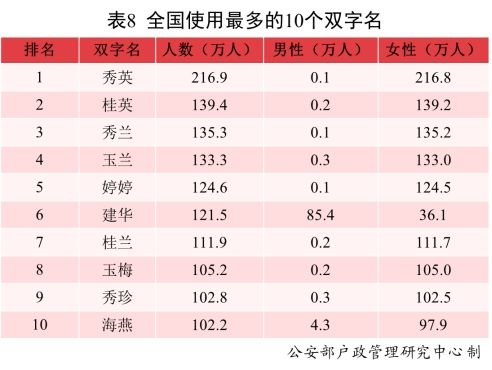 全国户籍人口中,使用频率最高的10个双字名依次为:秀英、桂英、秀兰、玉兰、婷婷、建华、桂兰、玉梅、秀珍、海燕。其中“秀英”名列榜首,使用人数为216.9万。