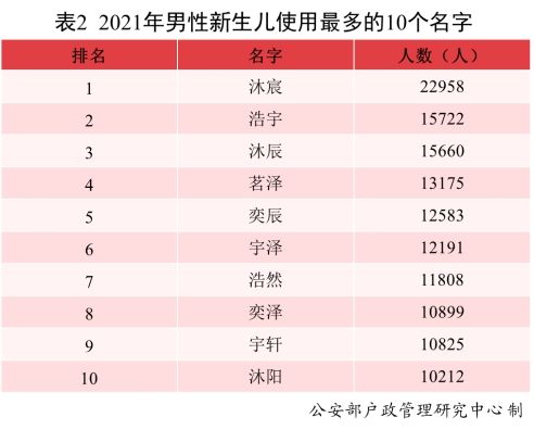 2021年出生并已经进行户籍登记的男性新生儿中,从浩宇、沐辰、浩然、沐阳等使用频率最高的名字可以看出阳光大气的寓意。