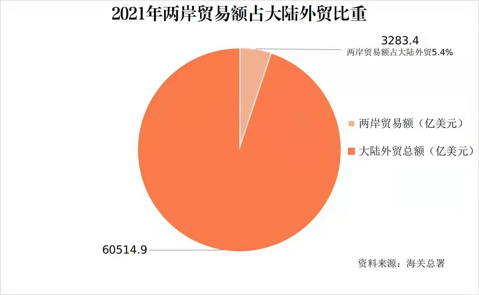 朱凤莲表示,据海关总署统计,2011年两岸贸易额为1600.3亿美元,2021年两岸贸易额增长至3283.4亿美元,10年间两岸贸易额翻了一番。两岸贸易额占大陆外贸的比重从2011年的4.4%增长至2021年的5.4%增长了1个百分点。据台湾方面统计,两岸贸易额占台湾外贸比重从2011年的28.6%增长至2021年的33%,增长4.4个百分点。大陆稳居台湾地区最大出口市场和最大贸易顺差来源地。
