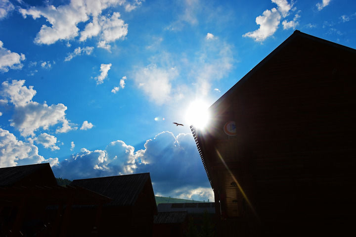 ↑2021年7月24日,在新疆阿勒泰地区的喀纳斯景区禾木村,一只飞鸟掠过天空。