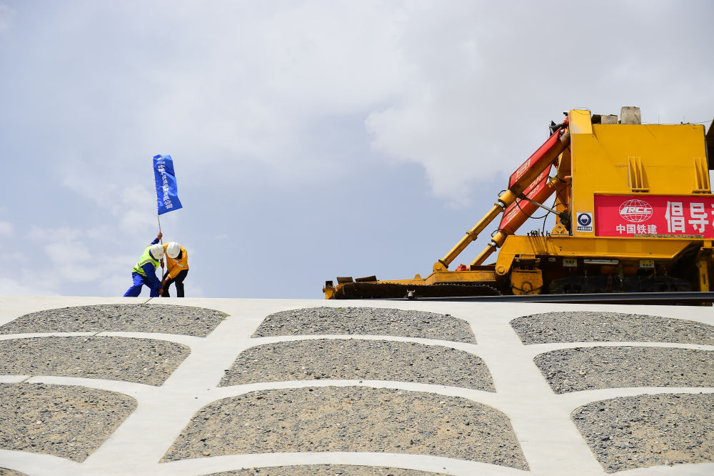 ↑和若铁路建设者在铺轨现场重新插上被风吹倒的旗杆(2021年6月23日摄)。